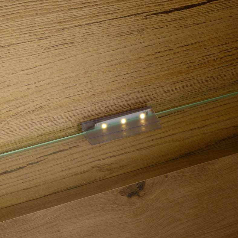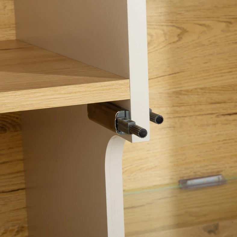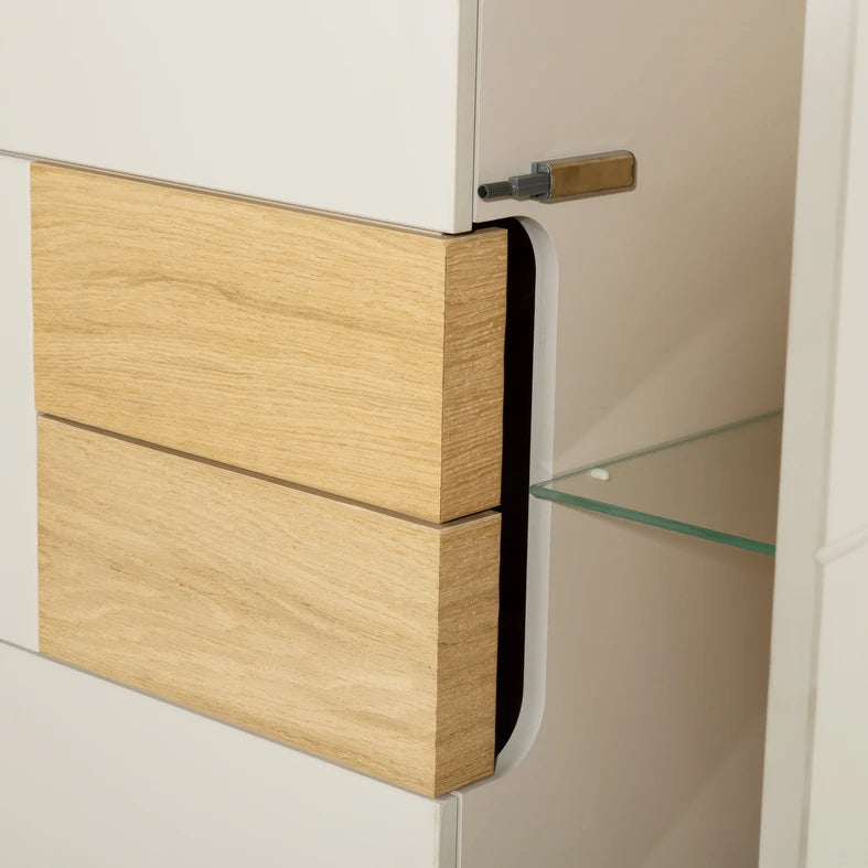Crafted in a warm artisan oak body with smooth cashmere-finished fronts and refined oak wood accents, this cabinet reflects the signature modern look of the Bruno Collection. The glass-fronted display section allows you to highlight your favourite items, while the enclosed compartments keep everyday essentials neatly tucked away.