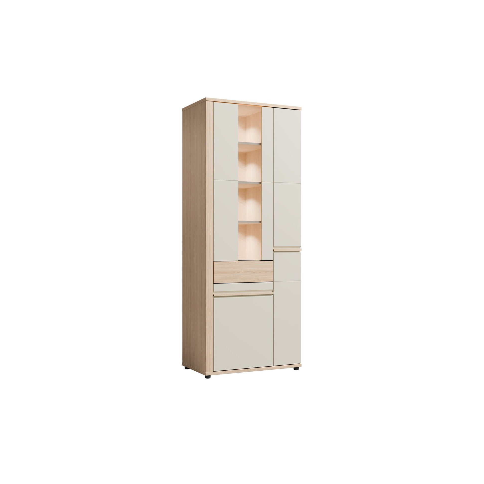 Finished in a soft cashmere tone with a light wood frame, this cabinet reflects the clean, Scandinavian-inspired design of the Oslo Collection. One of the doors features a glass display panel with integrated LED lighting, ideal for highlighting your favourite glassware, décor, or collectables. The other sections provide enclosed storage, helping you keep essentials neatly tucked away.